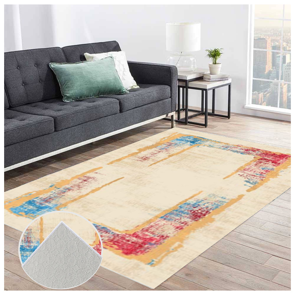 Ovaj tepih u Boja Ram Bež stilu donosi modernu kombinaciju bež osnove i živopisnog, apstraktnog ram efekta u više boja.