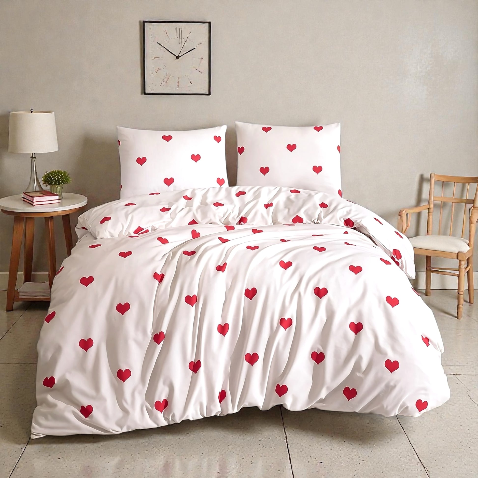 | Bračna posteljina Velika Srca unosi romantičnu i veselu energiju u svaku spavaću sobu. Bela podloga sa krupnijim crvenim srcima daje toplu i razigranu estetiku, čineći krevet centralnom tačkom prostora. Ovaj dezen je idealan za parove, mladence ili sve koji žele da svom domu dodaju dašak nežnosti i pozitivne atmosfere. Materijal sa 70% pamuka obezbeđuje udobnost i prozračnost tokom sna, dok sintetička vlakna doprinose manjem gužvanju i lakšem održavanju. Posteljina je prijatna na dodir, nežna prema koži i pogodna za upotrebu tokom cele godine. S obzirom na svoj neutralan i svetao ton, dezen se lako kombinuje sa belim, drvenim ili pastelno obojenim nameštajem, kao i dekor jastucima u crvenoj ili bež boji. Sadržaj seta: Navlaka za jorgan: 200×220 cm Čaršav: 220×240 cm (bez lastiša) Jastučnice: 2 × 50×70 cm Prednosti: Krupna crvena srca za romantičan i veseo izgled 70% pamuka – udobno, prozračno i prijatno Čaršav bez lastiša, jednostavan za postavljanje Idealna za nove bračne parove, godišnjice i poklone Lako uklopiva u svetle i moderne enterijere |