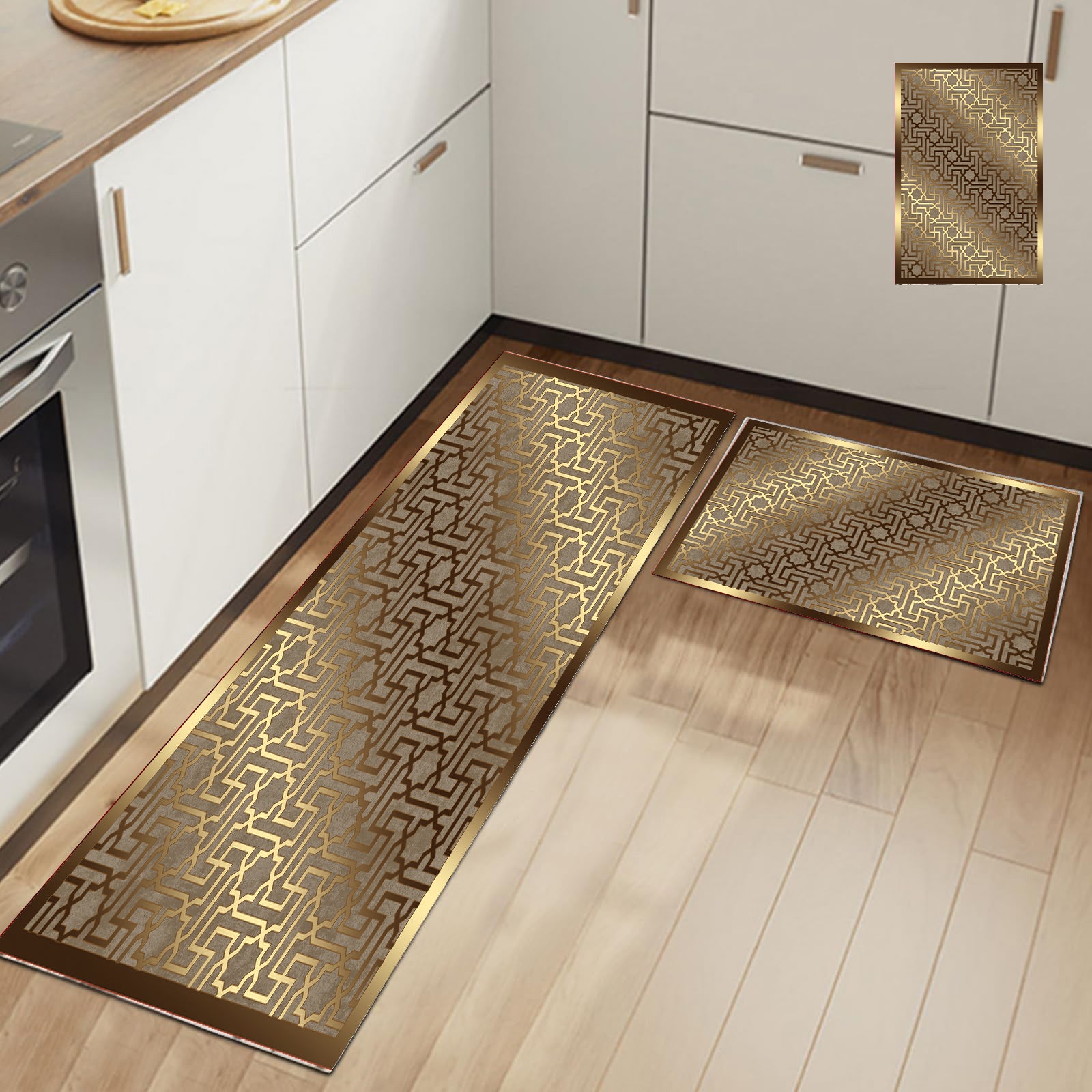 Gold kuhinjski set kombinuje bogate zlatne linije sa luksuznim orijentalnim motivima koji stvaraju elegantan i topao vizuelni utisak u kuhinji.